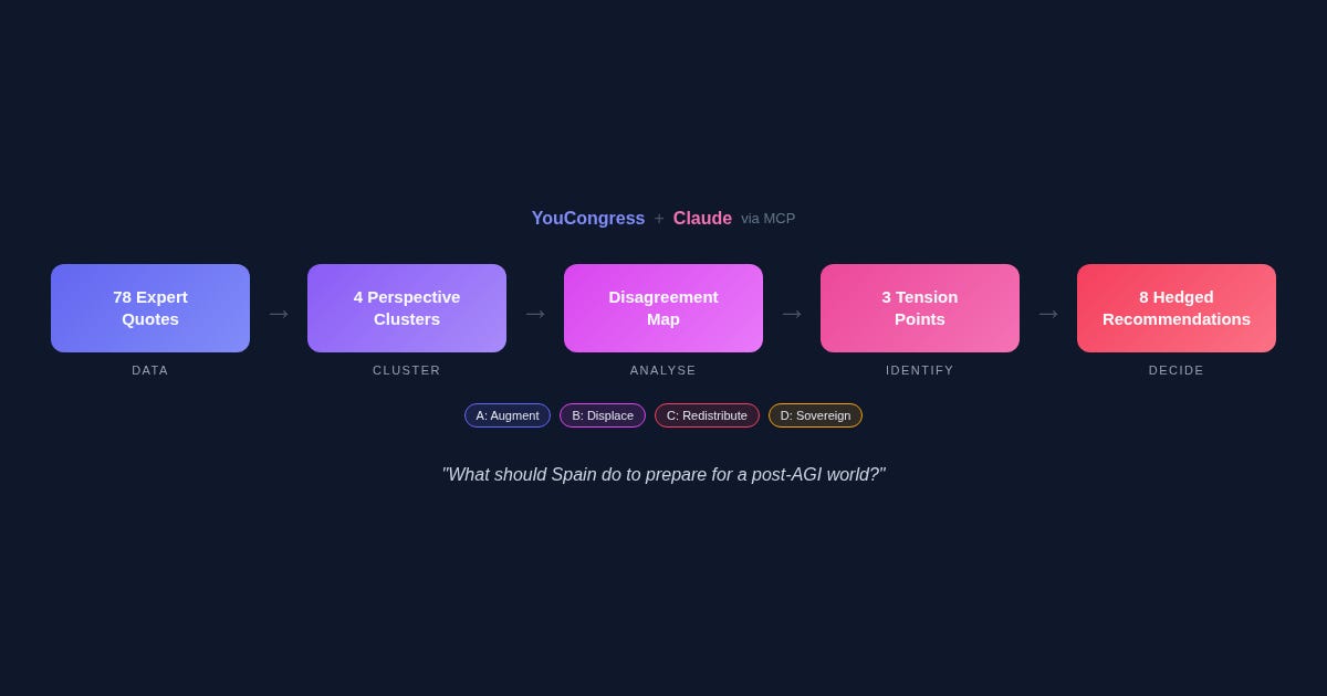 I asked Claude to pull quotes from YouCongress and answer the question. It retrieved 78 expert quotes and produced the analysis below.